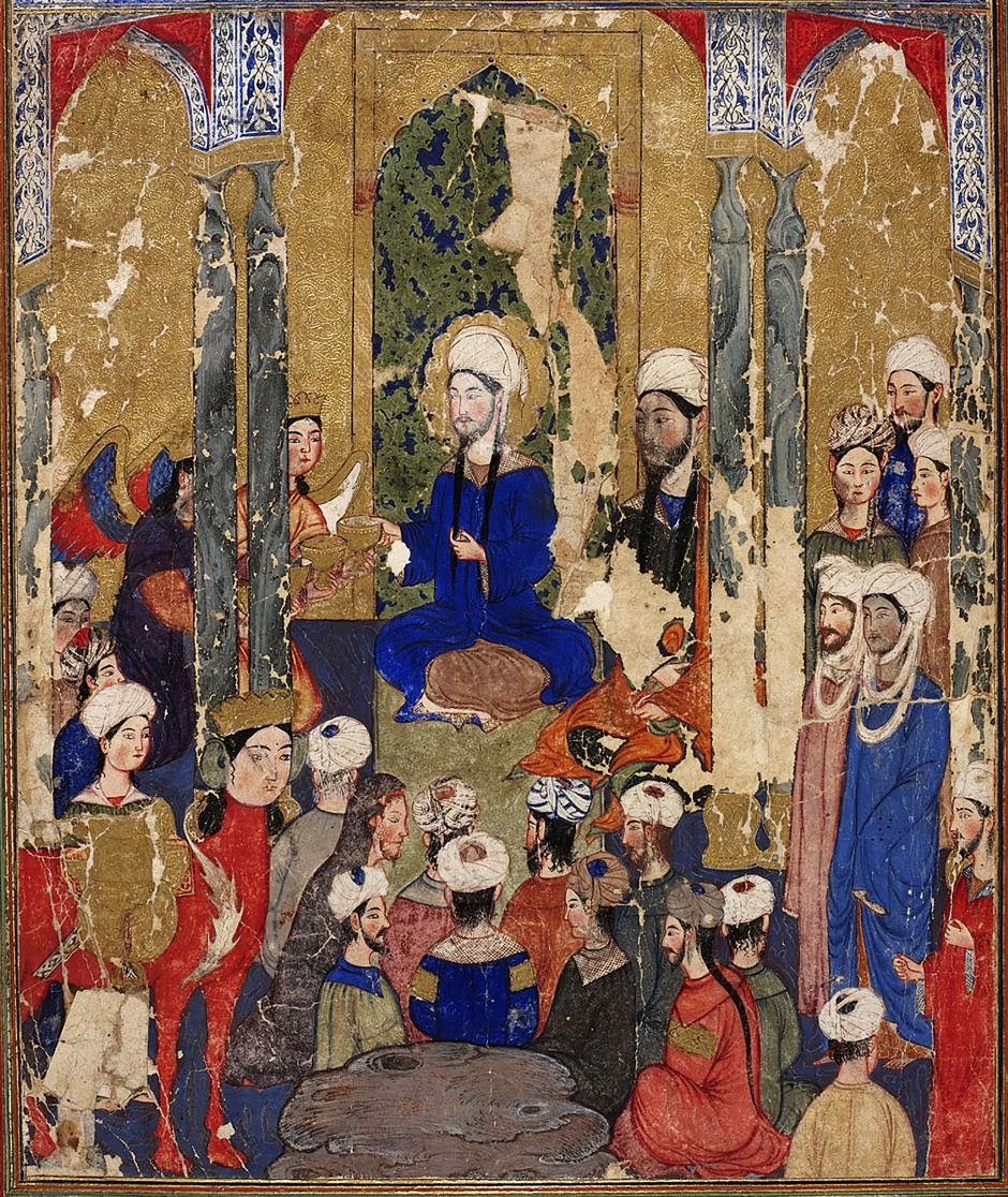 Religion of Peace Update #5 - that whole ban on drawing Muhammad that's caused deaths in Sweden, Paris, and now Texas - IT'S A LIE. Nowhere in the Koran does it prohibit figural imagery of Muhammad. Nowhere in Islamic "law" is there a single decree banning the figural imagery of Muhammad. In fact the closest thing in Islamic "law" that comes to a ban on imagry was published in 2001 by those highly respected intellectual scholars - The Taliban - but the decree was against non-Islamic temples and shrines, no mention of Muhammad was made. In fact, historically, Muhammad was quite often depicted in art and no one died for it. Here's a picture of Muhammad (he's the guy in blue) from a 14th Century Islamic work now in the Topkapı Palace Library in Constantinople. Do you see huge mobs of outraged beards trying to burn down western Turkey?